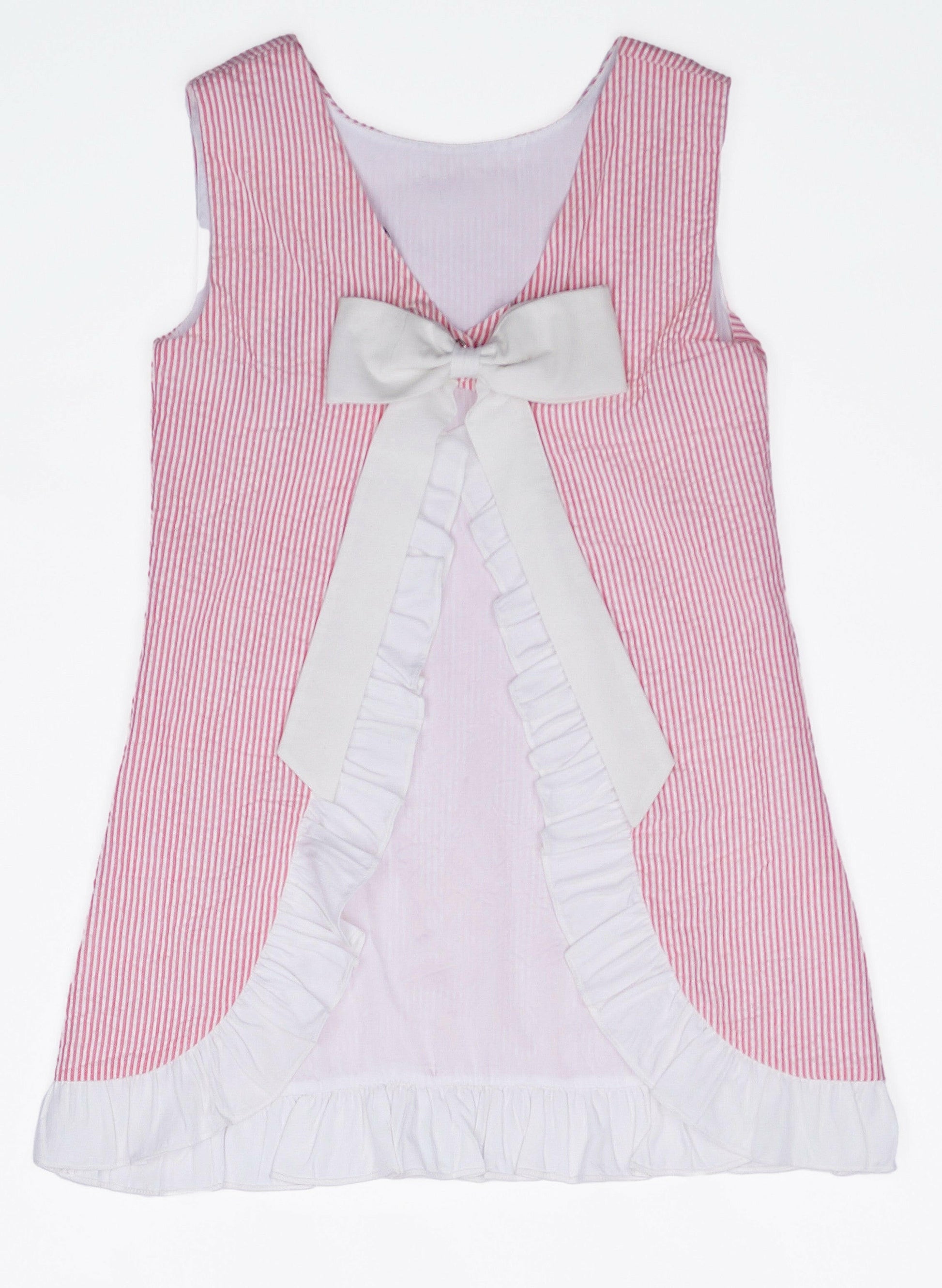 Soft, breezy seersucker in a rosy coastal hue makes this ruffle back top a summer standout. Cascading ruffles and a sweet bow create a picture-perfect look, while the detachable magnetic bow makes wash day easy and adds versatility. A silky lining keeps her comfortable through every seaside adventure.